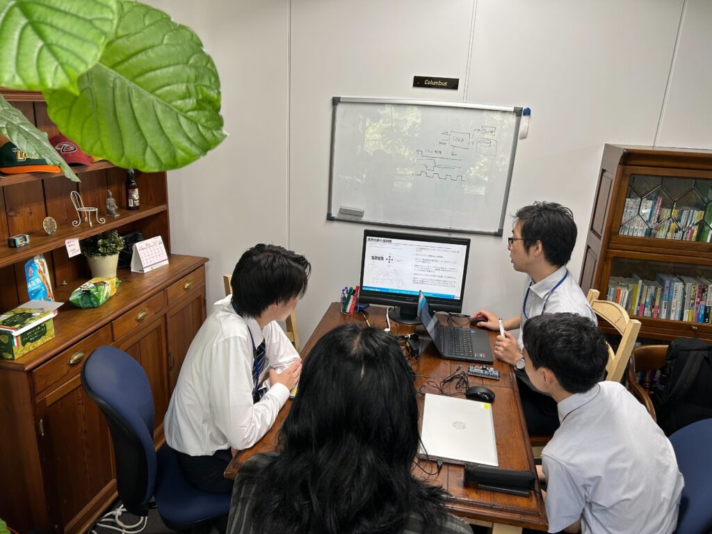 写真は、デジタル回路メンバーがプレゼン会場の会議室でリハーサルをしているところです。5日間の成果を精一杯表現してほしいです。