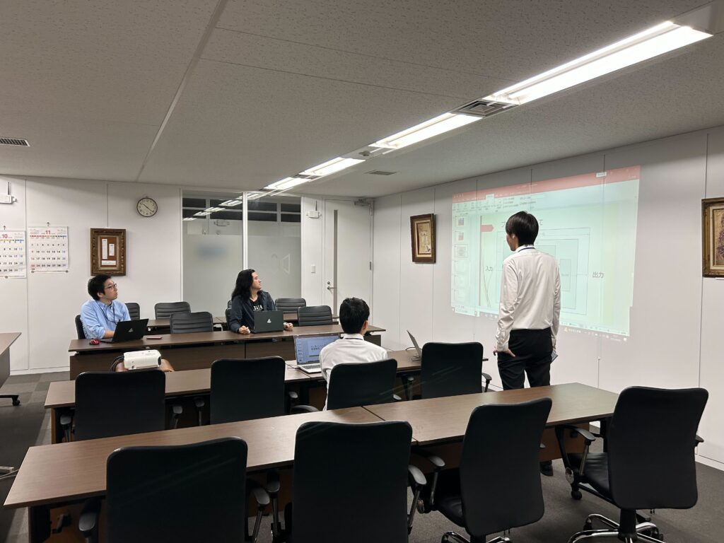 オリエンテーションの後は、すぐ机上設計に向けた講義が始まります。写真はデジタル回路設計メンバーが、先輩エンジニアがこれから作るデジタル回路について分かりやすく説明してくれています。(手前のロン毛の男性も回路設計エンジニアです。ワイルドですね)