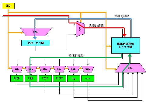 • 処理1(赤色経路): 制御部(SEQ)の命令により、変数メモリ部から演算に必要な変数を抽出し、演算結果格納レジスタ部へ書き込みます。