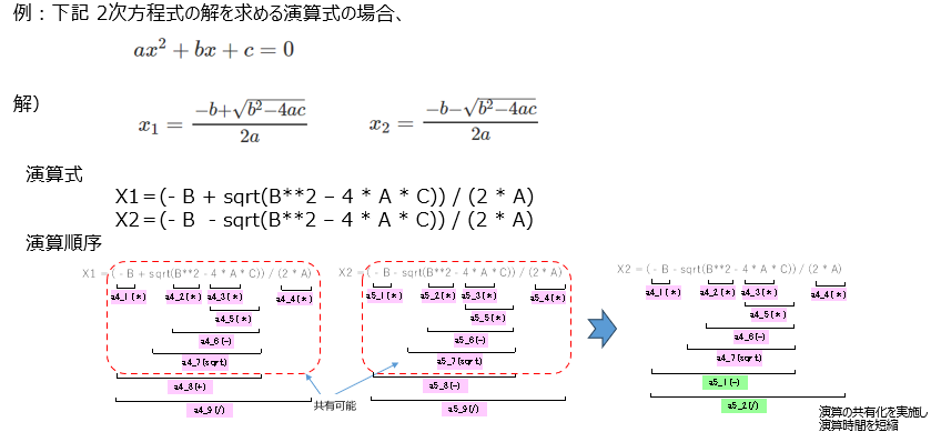 上図で2次方程式の解は X1 と X2 の2つがありますが、その中身である や分母の 2a は共通しており、共有化できます。共有化は、演算式の演算順序において、共通する計算ブロック(図中の赤い破線囲み部分)を一度だけ計算し、結果を再利用することで実現します。これにより無駄な演算サイクルを排除し、回路規模を抑えつつ処理時間を大幅に短縮することが可能になります。