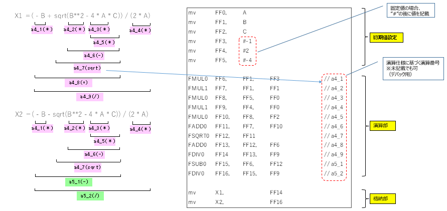 • 中段)演算部: FMUL(乗算)、FADD(加算)、FSQRT(平方根)などの演算命令を並べ、共有化したフローに沿って実行します。