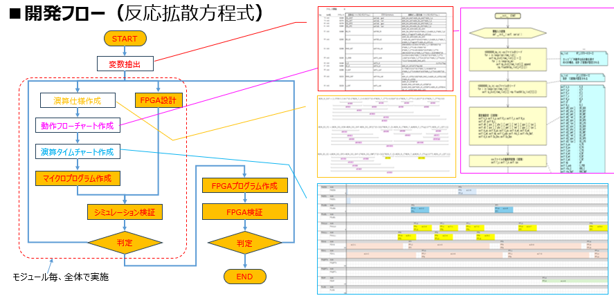 具体的には、Python関数をそのまま移植するのではなく、べき乗や行列演算といった処理を、ハードウェアで実行可能な「単純演算の連なり」へと分解・展開します。この展開された仕様に基づき、マイクロプログラムを作成し、演算タイムチャートを策定することで、演算の順序に合わせてFPGA上でのリソース割り当てタイミングも最適化していきます。