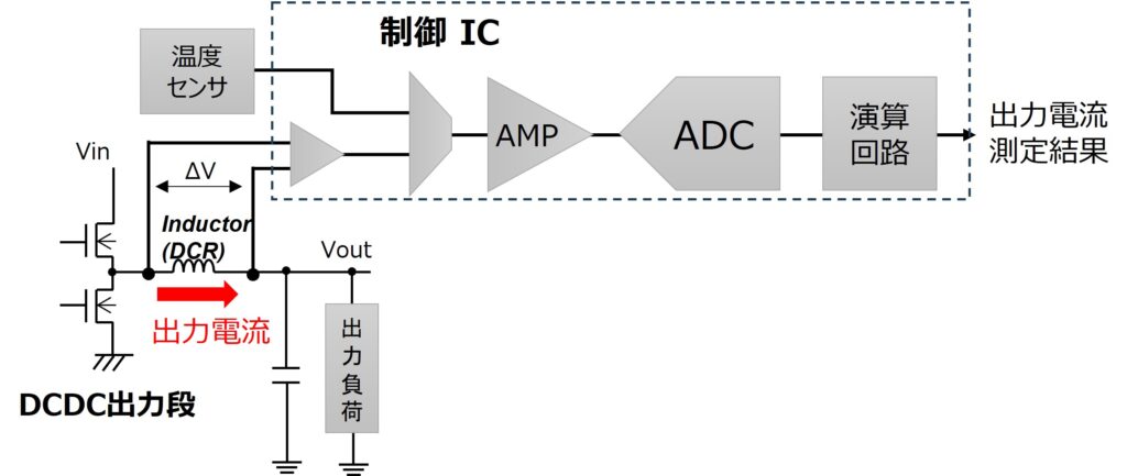 DCDCコンバータにおいて、出力電流を正しく測定することは過電流保護や効率管理のために欠かせません。IPCでは出力電流をインダクタ両端の電圧差(ΔV)を利用して測定する方法を使っています。インダクタには寄生抵抗(DCR)があり、この抵抗値を使って「 出力電流 = ΔV / DCR[Ω] 」を求める仕組みです。