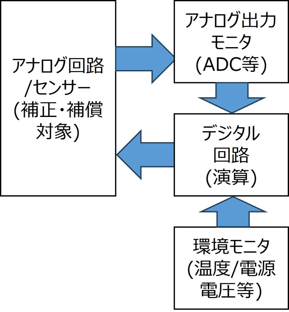 最後は、温度や電源電圧といった外部環境に応じて補正する方式です。温度センサーなどの環境モニタから得られた値をもとに補正演算を行い、アナログ回路に反映させることで、温度や電源条件が変わっても安定した測定や制御が可能になります。